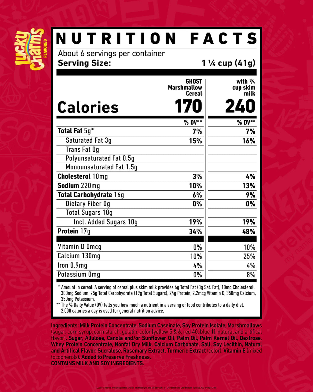 GHOST PROTEIN CEREAL + MARSHMALLOWS Flavor: This mashup of crunchy cereal puffs and Lucky Charms™ marshmallows brings legendary flavor without sacrificing macros. Each serving contains an excellent source of protein (17G per serving) and a good source of calcium. Grab a box for a crave-worthy, high protein cereal to help you stay on track from morning to night!
