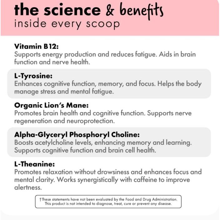 L-Theanine: Promotes relaxation without drowsiness and enhances focus and mental clarity. Works synergistically with caffeine to improve alertness.