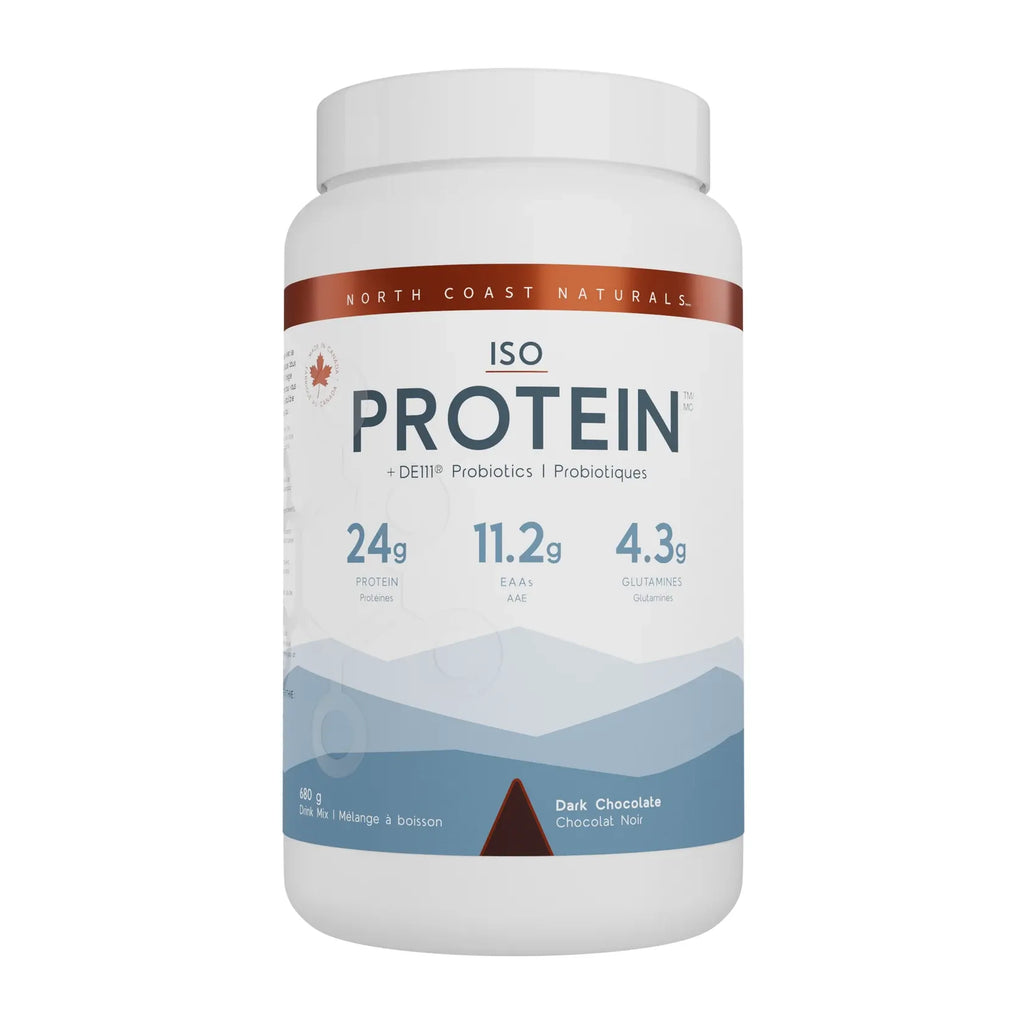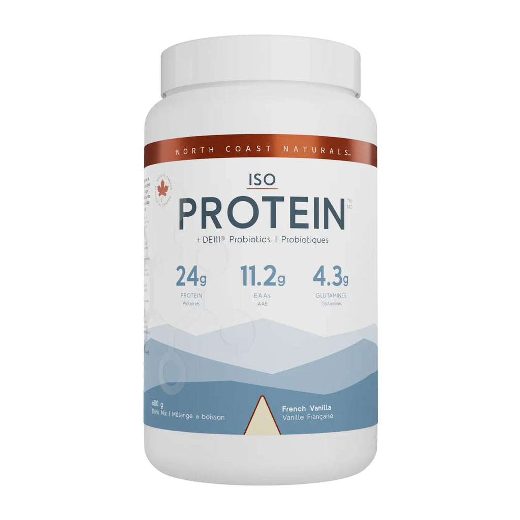 North Coast Naturals ISO Protein 100 offre 24 g de protéines par portion, à partir de petit-lait canadien nourri à l’herbe, ultra-filtré et 97 à 99,5 % sans lactose.