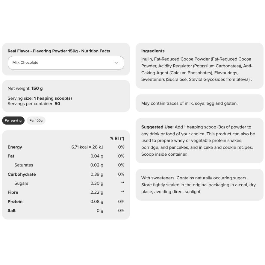 Inulin, Fat-Reduced Cocoa Powder (Fat-Reduced Cocoa Powder, Acidity Regulator (Potassium Carbonates)), Anti-Caking Agent (Calcium Phosphates), Flavourings, Sweeteners (Sucralose, Steviol Glycosides from Stevia).