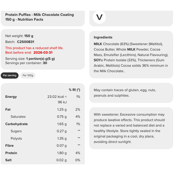 Ingredients: White Chocolate-Covered Soya Protein Crisps (50%) (White chocolate (32%) (Sweetener (Maltitol), Cocoa Butter, Whole MILK powder, Skimmed MILK Powder, Emulsifier (Lecithins), Natural Flavouring), SOYa Protein Isolate, Thickeners (Gum Arabic, Maltitols)), Milk Chocolate-Covered Soya Protein Crisps (50%) (MILK Chocolate (32%) (Sweetener (Maltitol), Cocoa Butter, Whole MILK Powder, Cocoa Mass, Emulsifier (Lecithins), Natural Flavouring), SOYA Protein Isolate, Thickeners (Gum Arabic, Maltitols)) .