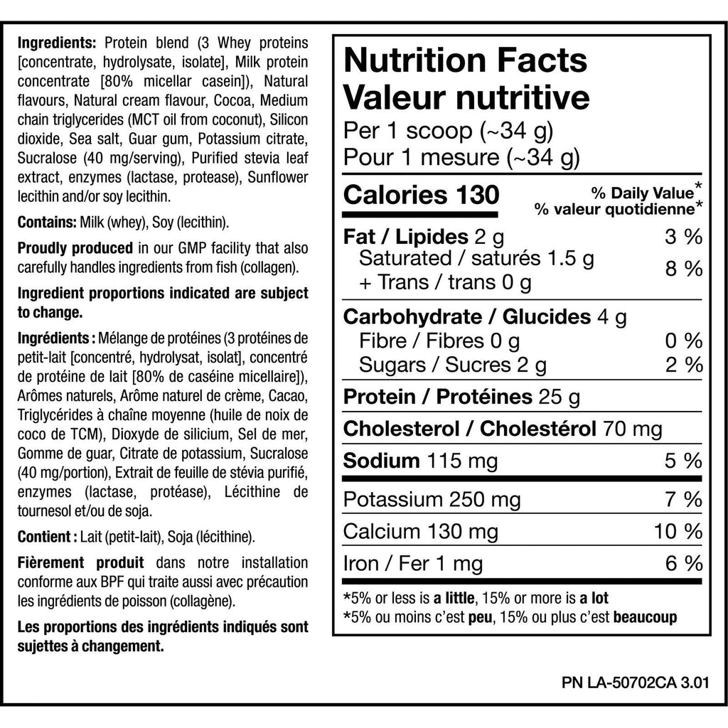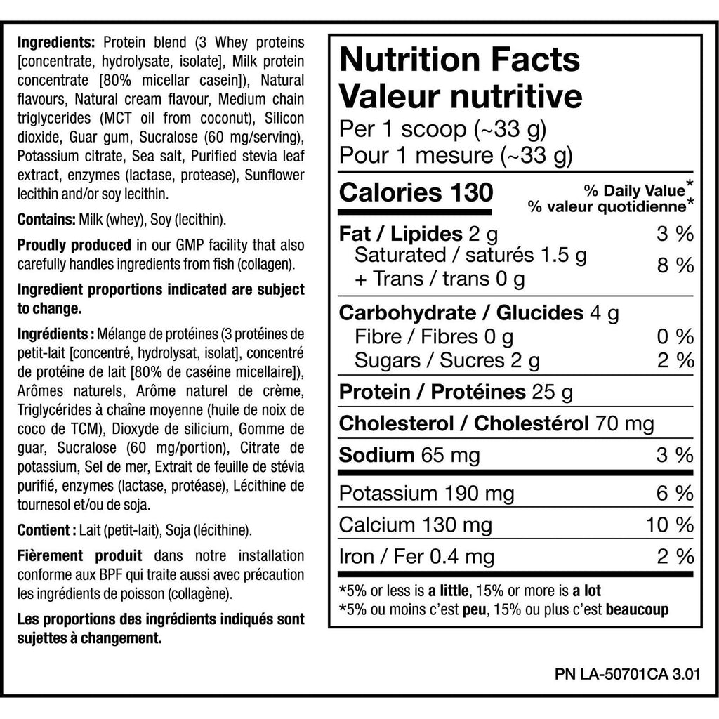 Ingredients (vanilla): Protein blend (3 Whey proteins [concentrate, hydrolysate, isolate], Milk protein concentrate [80% micellar casein]), Natural flavours, Natural cream flavour, Medium chain triglycerides (MCT oil from coconut), Silicon dioxide, Guar gum, Sucralose (60 mg/serving), Potassium citrate, Sea salt, Purified stevia leaf extract, enzymes (lactase, protease), Sunflower lecithin and/or soy lecithin.