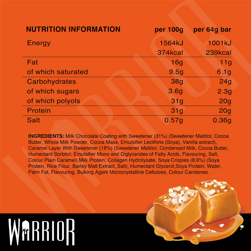 CRUNCH bars are packed with 20 grams of healthy protein, encased in a layer of gorgeously gooey caramel, and wrapped in delicious chocolate. Warrior CRUNCH bars have almost as much protein as a chicken breast, yet taste like a Michellin starred desert. Just 2.3g's of sugar per bar, and 2.3g of impact carbs, Warrior CRUNCH is the perfect protein bar for dieting, eating clean, and keeping lean all year round.